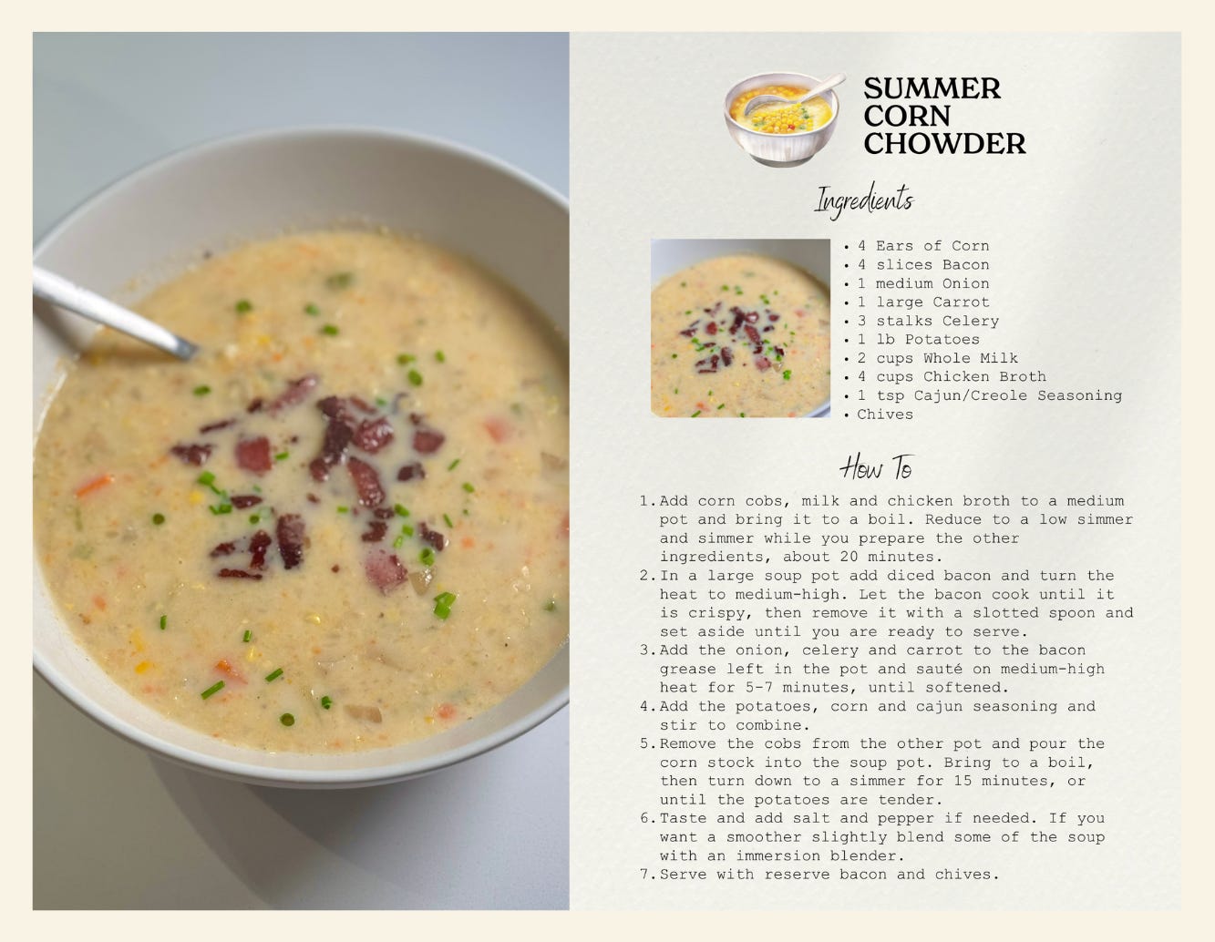 Us Americans love chowder. Although it has a reputation for being heavy with cream and butter, in the summer, I love making a lighter version of corn chowder using milk and chicken broth instead.