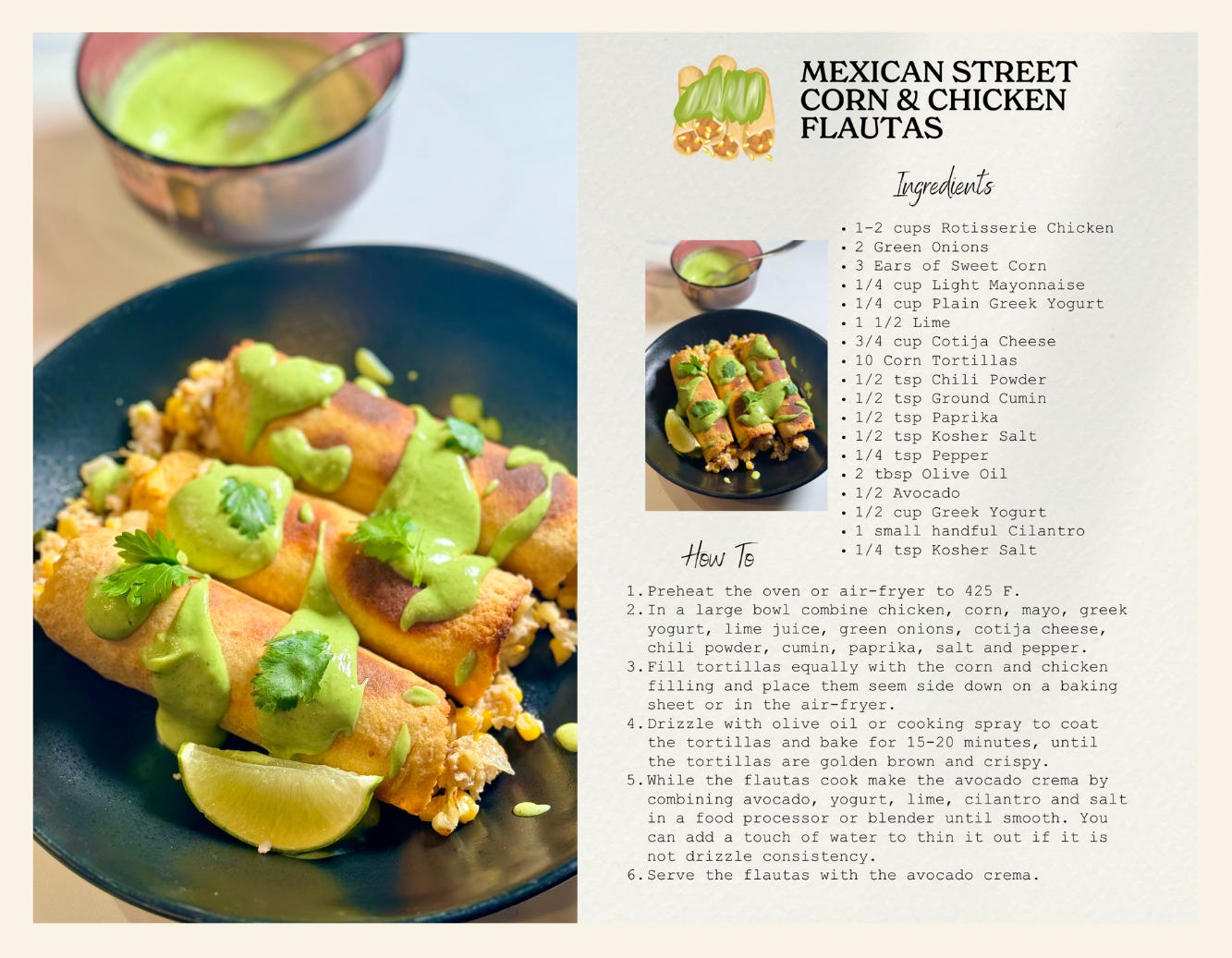 We’re not done with raw corn just yet. If you are unfamiliar with Flautas, they are crispy rolled tacos typically filled with chicken and cheese and topped with guacamole and pico de Gallo. But because we are loving corn right now, I added raw corn prepared Mexican street-style to the chicken (you could use black beans instead for a vegetarian version) filling. Mexican street corn is typically made with mayonnaise, sour cream, cotija cheese, and lime. For a healthier alternative, I swapped the sour cream for Greek yogurt and baked them in my air fryer (but you could also bake these in the oven). Then I finished them with a drizzle of avocado crema.